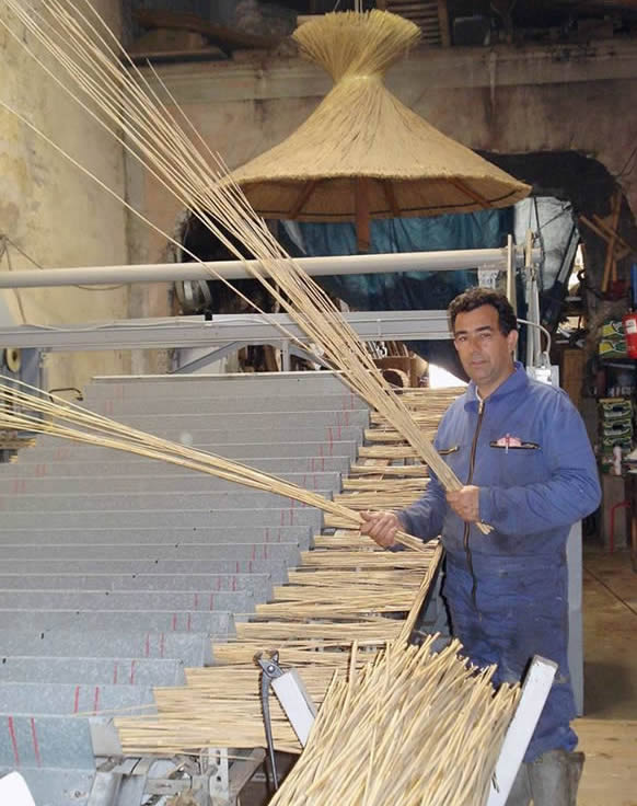 Dans son atelier, il confectionne les « paillassons » qui serviront pour la couverture de pergolas, la fabrication de parasols, de brise-vent, etc.