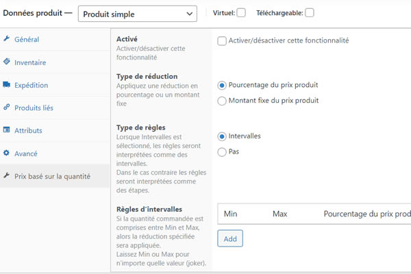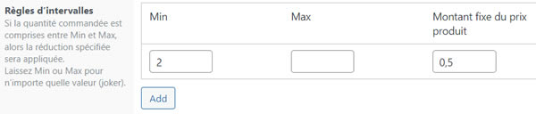 Par exemple, si vous souhaitez faire une remise de 0.50 € sur le prix du produit à partir du 2ème produit acheté, cliquer sur Activer cette fonctionnalité, puis, cliquer sur Montant fixe du produit, et enfin, sur le bouton Add pour ajouter une règle d’intervalle.