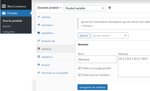 - Créer un produit variable pour donner le choix sur le montant de la carte cadeau.
